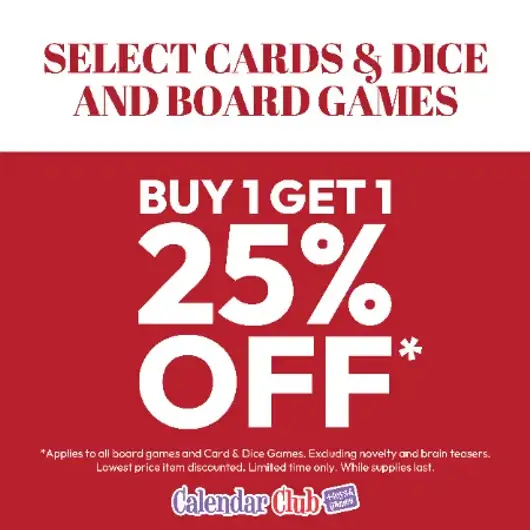 *Applies to all board games and Card & Dice Games. Excluding novelty and brain teasers. Lowest price item discounted. Limited time only. While supplies last.
