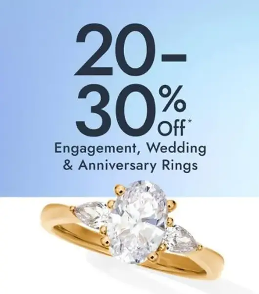 Don't miss out! Shop in store and get 20-30% off on select engagement, wedding and anniversary rings.