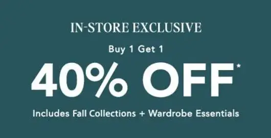Don't miss this! Shop in store and enjoy buy 1, get 1 40% off on select regular-priced styles, for a limited time.
