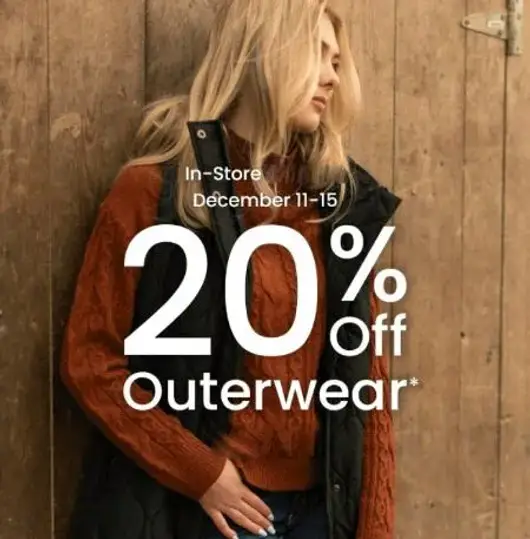 Offer is valid in store from December 11, 2025 until December 15, 2025. Offer includes regular and sale priced outerwear. Offer cannot be stacked with any other promo or discount. Offer cannot be applied to previously purchased merchandise or the purchase of gift cards.